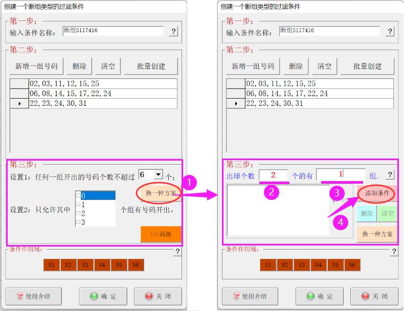 简单的说就是我们判断几组(或区间)号码的开出情况,比如我们把号码分成5个区间,通过查看走势图,可以发现通常有一部分区间是挂空的。我们以此作为一个过滤条件,称之为“断组”。当然,软件里的断组设置很灵活,各组号码及设置的条件都可以自由灵活的让用户自行设定。设置方法如下图所示——